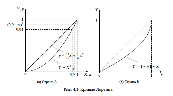Кривая Лоренца в стране $А$ описывается уравнением $Y = X^2$; иными словами, доля $X ∈ [0; 1]$ наиболее бедного населения получает долю $X^2$ всего дохода общества.