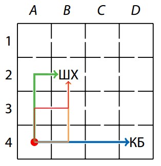 Из-за специфики системы улиц и заграждений в Капучиновске переход между соседними районами возможен только через середину границы между ними, то есть каждый житель города перемещается по нему как ладья по шахматной доске, измеряя при этом расстояния количеством переходов через границу района. Например, жителям района $A4$ нет разницы, в какую кофейню ходить - кратчайший путь до каждой занимает три перехода (пути показаны на рисунке).