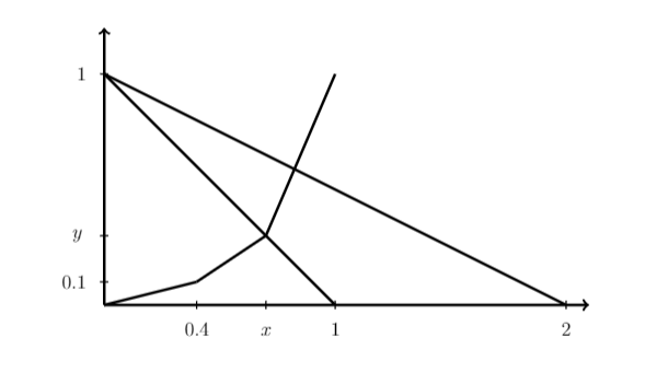 Однажды Петя нарисовал кривую Лоренца для страны с тремя группами населения, доходы внутри которых равны. Он успел даже отметить точку с коодинатами $(0,4; 0,1)$, однако понял, что решает не ту задачу и аккуратно зачеркнул чертеж линиями $y=1-x$ и $y=1-0.5x$. Когда этот чертеж нашел его друг Вася, он подумал, что это кривые спроса и предельных выручки и издержек для монопльной фирмы(что вполне логично). Если бы друзья посчитали коэфициент Джинни и прибыль монополиста они получили бы, что они относятся как $\dfrac{\pi}{G}=\dfrac{5}{6}$. Определите координаты точки $(x, y)$