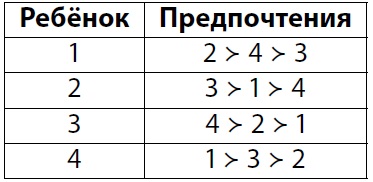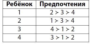 Администратору спортивного лагеря нужно расселить чётное количество детей из первого отряда по комнатам. В каждой комнате могут жить ровно 2 человека. Все дети — девочки, поэтому изначально возможна любая пара потенциальных соседей. У каждого из детей есть предпочтения на множестве потенциальных соседей, то есть каждый из ребят может упорядочить всех потенциальных соседей от наилучшего для себя до наихудшего. При этом, для каждого из ребят эти предпочтения строгие — не существует двух соседей, которые были бы одинаково хороши с точки зрения кого-либо из ребят. Предпочтения также являются транзитивными, то есть если для девочки верно, что $i$ лучше $j$ (обозначим это утверждение как $i \succ j$) и $j \succ k$, то для неё верно $i \succ k$.