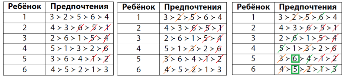 Шаг 2. Заметим, что из оставшихся возможных опций 5 и 6 — лучшие друг для друга (обведено зелёным на картинке). Значит, они будут жить вместе. Тогда зачеркнём зелёным невозможные пары из числа оставшихся.