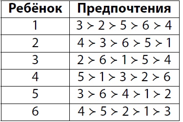 в) Предположим, что администратору нужно расселить 6 детей. Для удобства занумеруем их от 1 до 6. Их предпочтения представлены в таблице ниже. Выражение $i \succ j$ означает, что, по мнению ребёнка, сосед $i$ лучше соседа $j$. Найдите все стабильные расселения и докажите, что других не существует.