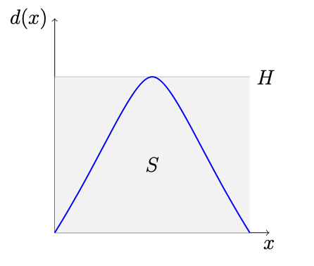 Следовательно, площадь под графиком $d(x)$ на отрезке $[0,1]$ не превосходит площади прямоугольника ширины $1$ и высоты $H$, откуда следует что