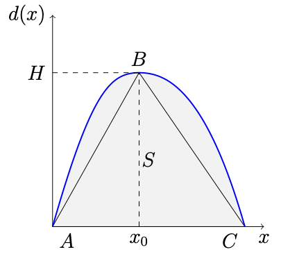 Так как график $d(x)$ не ниже ломаной, площадь под графиком $d(x)$ не меньше $S_{ABC}=\frac{H}{2}$. Откуда