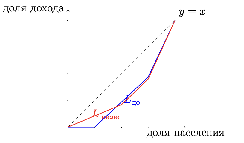 Ниже — пример кривых Лоренца до и после для случая $m=3$ (всего $n=4$ человека).